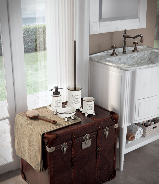 SET 4 PEZZI ACCESSORI BAGNO SHABBY MODELLO AMELIA IN CERAMICA DECORATA DA APPOGGIO Amelia, la nuova serie di accessori bagno Shabby Chic. La linea completa è composta da 4 articoli tutti in ceramica con decorazioni su bordo e piedini, e scritta decorativa frontale.Ideale per chi vuole impreziosire un ambiente con arredamento arte povera. Portasapone a forma di vasca da bagno: 13,5X8 cm, altezza 5,8 cm Porta scopino con manico in metallo e completo di ciuffo in setole: diametro 10,4 cm, altezza 48,5 cm Dosa sapone con erogatore in metallo: diametro 7,5 cm, altezza 19 cm Porta spazzolini: diametro 8 cm, altezza 11,3 cm