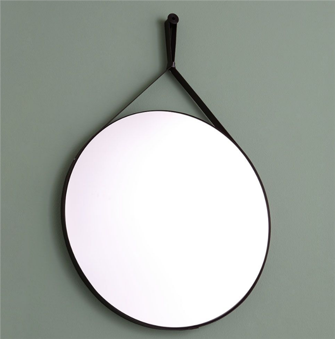 SPECCHIO BAGNO DESIGN ROTONDO E CORNICE CON LACCIO IN PELLE NERA