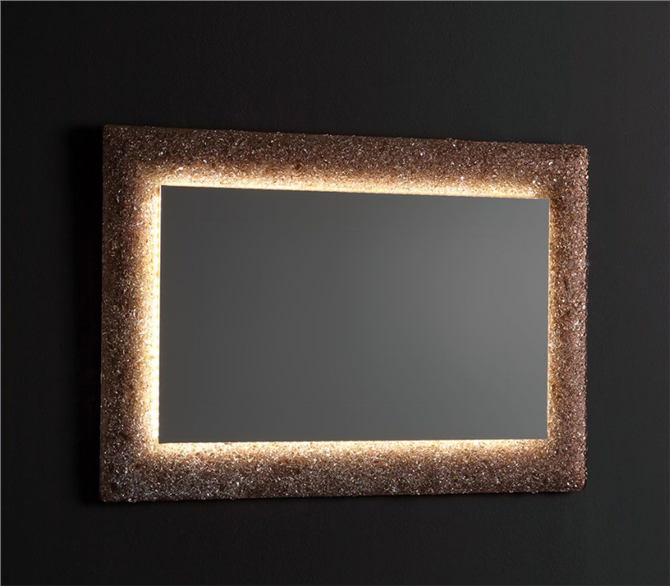 SPECCHIO CON CORNICE IN GRANIGLIA DI VETRO FUSO BRONZO E LED INTEGRATI 90X62