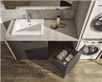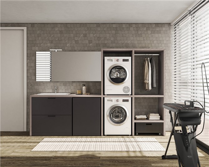 Nuovo progetto lavanderia BMT, innovativo negli elementi e ricco di complementi e accessori. Minimale, elegante, contemporaneo, pratico, funzionale e dinamico. Anello di giunzione tra bellezza e razionalità. Kosmo cambia le regole, sfrutta lo spazio con proposte compositive immediate e operative. Componibilità e trasversalità degli elementi consentono di progettare composizioni a proprio piacimento e adattabili ad ogni spazio. Kosmo si arricchisce di nuove soluzioni per facilitare ordine e pulizia. L. 308.1 cm - P. 63.7 cm - H. 196.5 cm