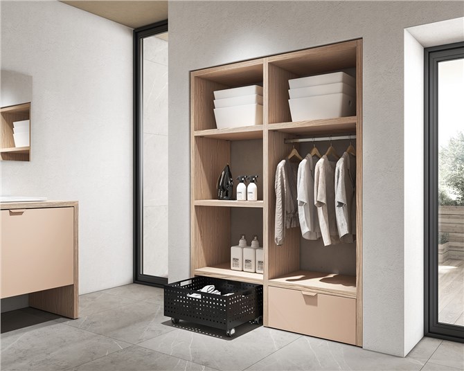 Ordine per la tua lavanderia. La Struttura 38 in essenza platano completa il portalavabo laccato cipria con un ampio top, integra la consolle Double 70 in Politek bianco opaco e accoglie lavatrice e asciugatrice, per poi trasformarsi in un elemento a parete operativo e iper-funzionale. L. 144.2 cm - P. 50.2 cm - H 196.5 cm