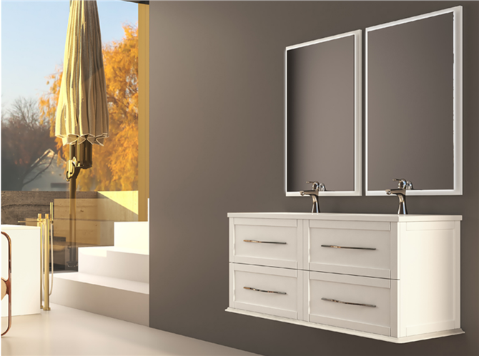 Intramontabile stile déco con spirito contemporaneo caratterizzano la linea Tiffany che si presenta con un forte impatto La collezione disponibile nelle finiture Bianco Opaco, Grafite e Blu Petrolio si presenta con una base sospesa o corredata da eleganti piedi in massello, dotata di ampi cassetti con modanature classiche e chiusura ammortizzata. I complementi in stile come le specchiere retroilluminate e le maniglie nella versione cromo o oro completano il tutto in un esclusivo accordo tra eleganza classica e gusto moderno.