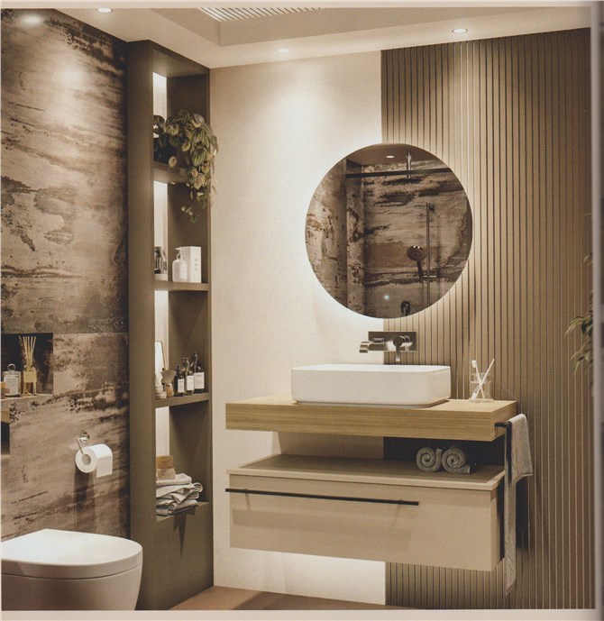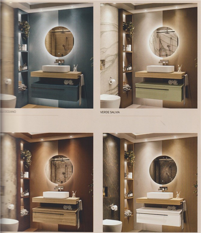 L'arredamento bagno che racchiude tutta l'eccellenza del made in Italy . composto da top con staffe , cassettiera, toppino, lavabo porcellana , portasciugamani specchio retroilluminato+ touch. .Disponibile nelle essense Verde Salvia, Tortora, Poro Noce, Blu Oceano , Bianco Luce, Modello caratterizzato da maniglia lineare in metallo disponibile anche guide con sponde in vetro cassetto illuminato con led integrati per una versione elegante e funzionale , chiusura ammortizzata . Genio creativo dei Designers ultime novità per l'arredamento del bagno. arredo-bagno in grado di suscitare un'intima compenetrazione tra l'ambiente arredato e coloro che lo vivono