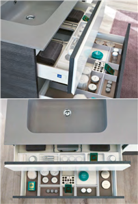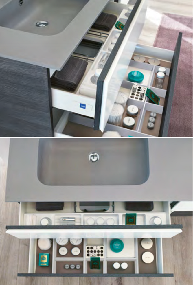Il design contemporaneo si sposa con la funzionalità: il porta trucchi per cassetto superiore, i divisori in legno per quello inferiore e il tappetino tortora per il cassetto senza scavo sifone garantiscono un contenere organizzato e corretto. Ogni accessorio fa sì che si raccordino armoniosamente forma e funzione, come note in un pentagramma. Il dettaglio della doppia anta sovrapposta, caratteristica che qualifica la linea TEKNO, è esempio della bellezza, della conoscenza profonda dei materiali e della cura per il dettaglio caratterizzanti il made in Italy nel mondo.