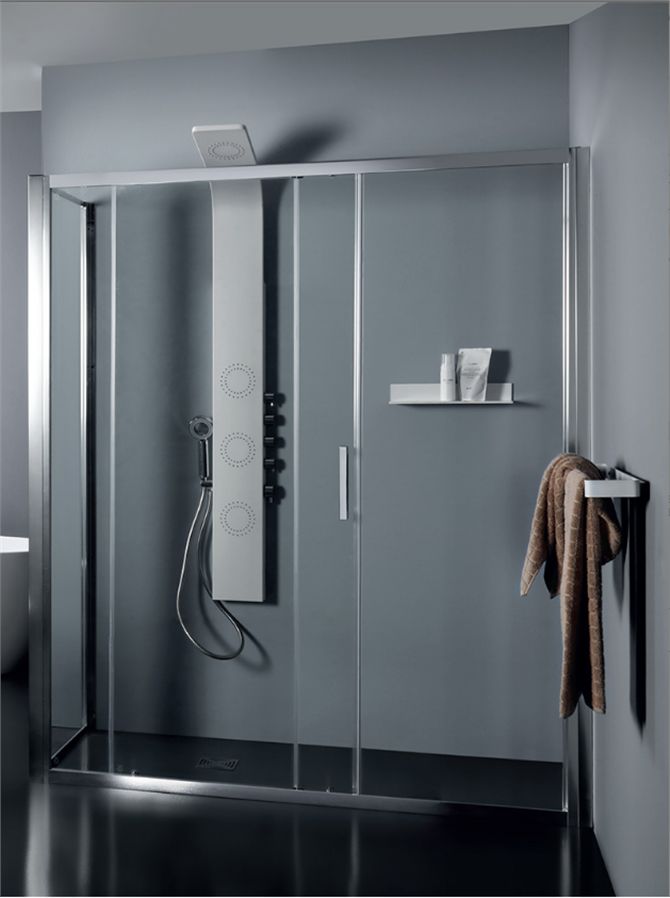 Porta scorrevole 6 mm Rettangolare, angolare, a nicchia, centro parete. Di raffinato pregio ed estremamente versatile le pareti a tutto cristallo con ante scorrevoli sono caratterizzate da una struttura dal design essenziale e moderno. Sono previste sia l’installazione direttamente a pavimento che sul piatto doccia. sono alte 2 metri  la chiusura è rallentata e hanno il trattamento anticalcare