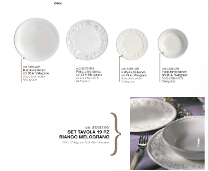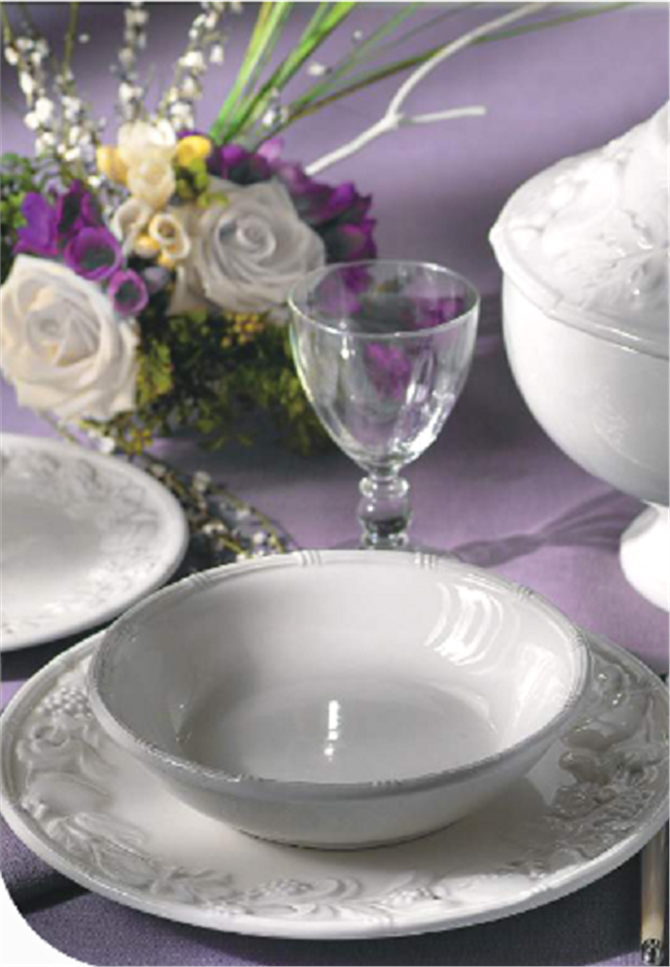 Ornamenti ain rilievo e la lucentezza della ceramica caratterizzano questo servizio di piatti dove la forma a ciotola del piatto fondo e la e l'insalatiera fanno da padrone . con il servizio si accompagna anche la linea d'arredo come le giardiniere, vasi e cachepot, lampade. Un coordinato Tiffani da avere nella vostra casa
