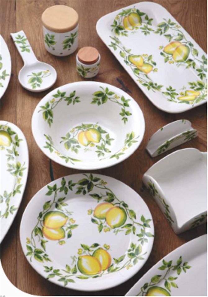 I limoni di Sorrento sono un simbolo di freschezza e dolcezza, un'esplosione di sapore che incarna il sole e la bellezza della Costiera Amalfitana. Da qualche parte c’è sempre il giallo di un albero di limoni .Conosci la terra dei limoni in fiore, dove i limoni d’oro splendono tra le foglie scure . Il limone ci parla ci dice che la bellezza dimora nelle cose semplici e tutte le cose vivono anche i ricordi e Il suo profumo .Quì Tiffani ci propone un decoro fresco e allegro ci fa riscoprire il piacere di sedersi a tavola , ci fa condividere belle emozioni con i nostri invitati . il set è composto da n. 6 piatti piani , n. 6 piatti fondi , n. 6 piattini . E' corredato da tantissimi articoli che troverete allegati