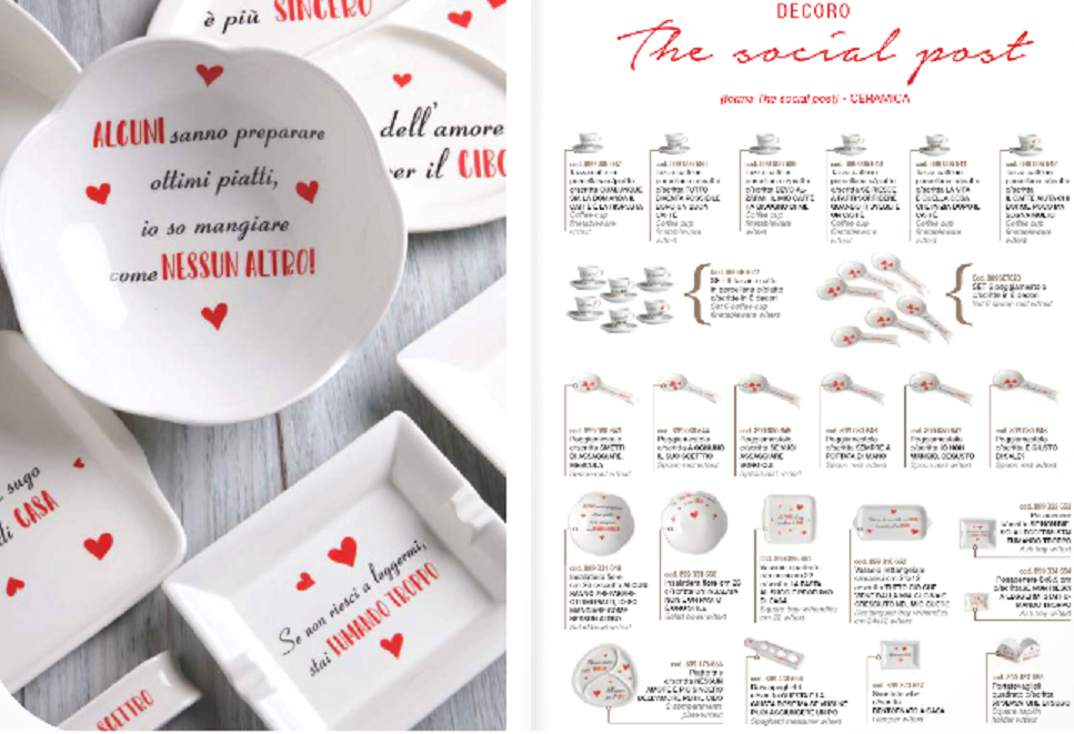 PIATTI DA TAVOLA TIFFANI THE SOCIAL POST Verba volant scriba manet dicevano gli antichi . Nell'epoca digitale della messaggistica istantanea dove la comunicazione è breve , veloce, chiara e coincisa l'epoca dell'immagine per eccellenza , ma anche dei testi che diventano immagine , Tiffani trasforma quei testi , quei messaggi in decoro , parte del quotidiano . Entrano a far parte del nostro vissuto e rimangono impressi in ciò che ci avvicina più di tutto il resto allo stare insieme , alla convivialità ,la tavola il cibo . Apparecchiare la tavola è un'arte per questo proponiamo diversi stili e soluzioni che consentono di giocare con la tavola come una tela , dare la possibilità di scegliere , lo stile e quindi avere una tavola adatta alle proprie esigenze e sempre originale .pochi articoli caratterizzano questa linea ma il loro design è originalissimo , la linea si può acquistare al pezzo secondo le esigenze