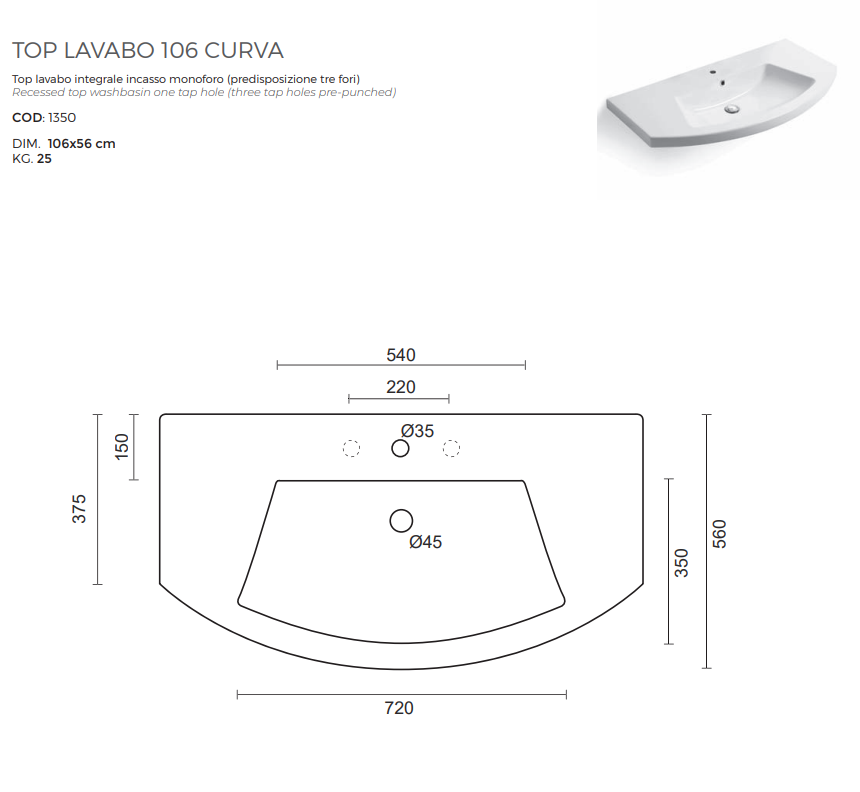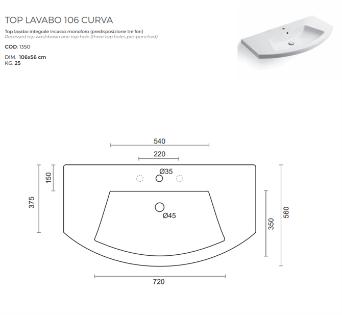 Top lavabo integrale incasso Curva 106 installazione ad incasso bianco lucido monoforo (predisposizione tre fori).