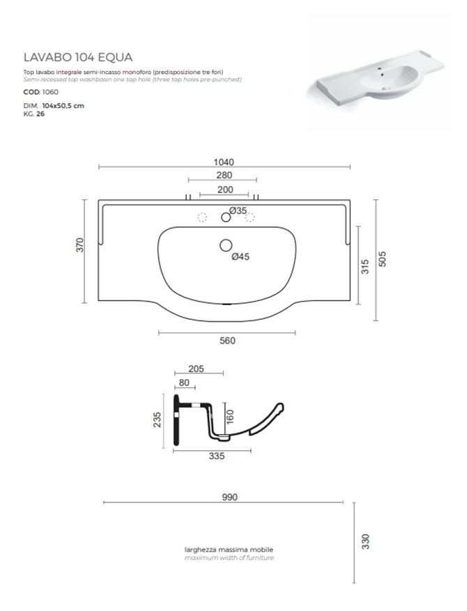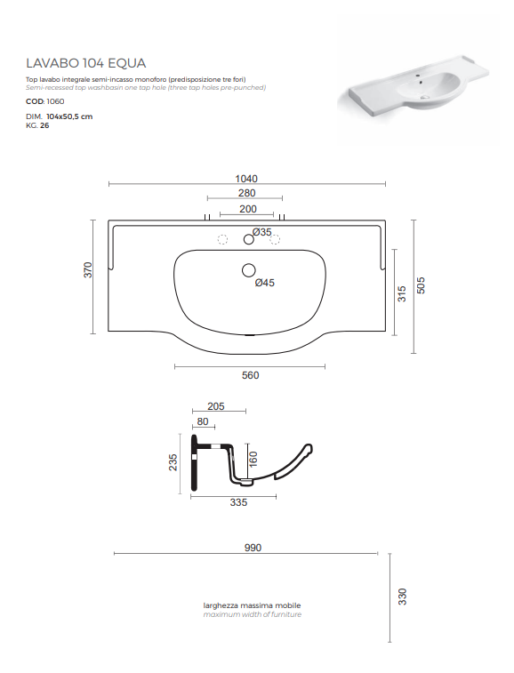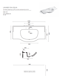 LAVABO A CONSOLLE INTEGRALE SOSPESO EQUA CM 104