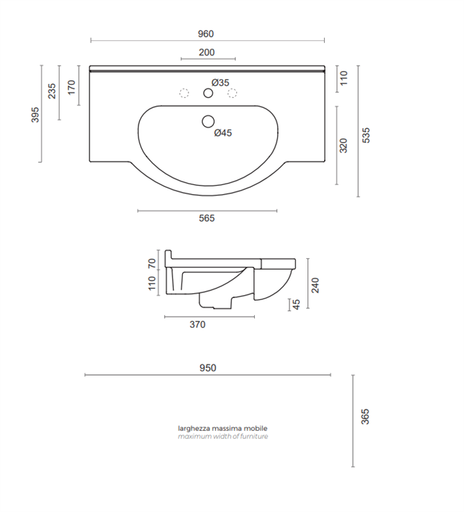 lavabo consolle semincasso integrale cm 96  bianco lucido monoforo (predisposizione tre fori). Disponibile anche da 71, 86
