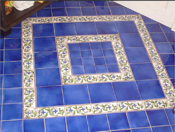 PAVIMENTO COTTO SICILIANO QUADROTTA CON INSERTI BLU E DECORATI