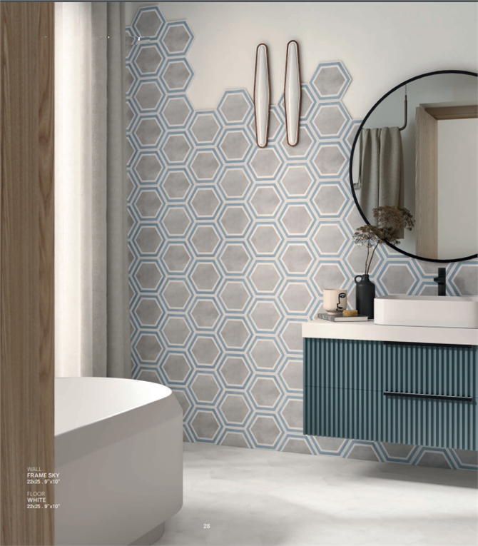 Cornici colorate e pattern che ricreano alveari, i decori Frame donano modernità agli spazi rendendoli ambienti di design e dal carattere deciso. Dallo stile industrial no al pop, Frame è un decoro trasversale adatto ad ogni tendenza e personalità, perfettamente combinabile con altri colori e con i suoi fondi.