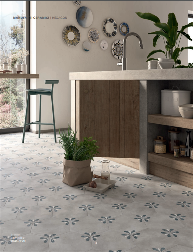 I decori Lily ricreano pattern attraverso i disegni tipici delle cementine, riadattati su formato esagonale, costruendo motivi ornamentali estremamente eleganti e rafnati. La classicità dei decori incontra la modernità dei colori ottenendo così una reinterpretazione originale della tradizione ceramica italiana