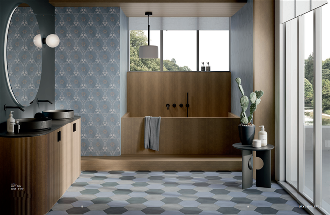 I decori Lily ricreano pattern attraverso i disegni tipici delle cementine, riadattati su formato esagonale, costruendo motivi ornamentali estremamente eleganti e rafnati. La classicità dei decori incontra la modernità dei colori ottenendo così una reinterpretazione originale della tradizione ceramica italiana