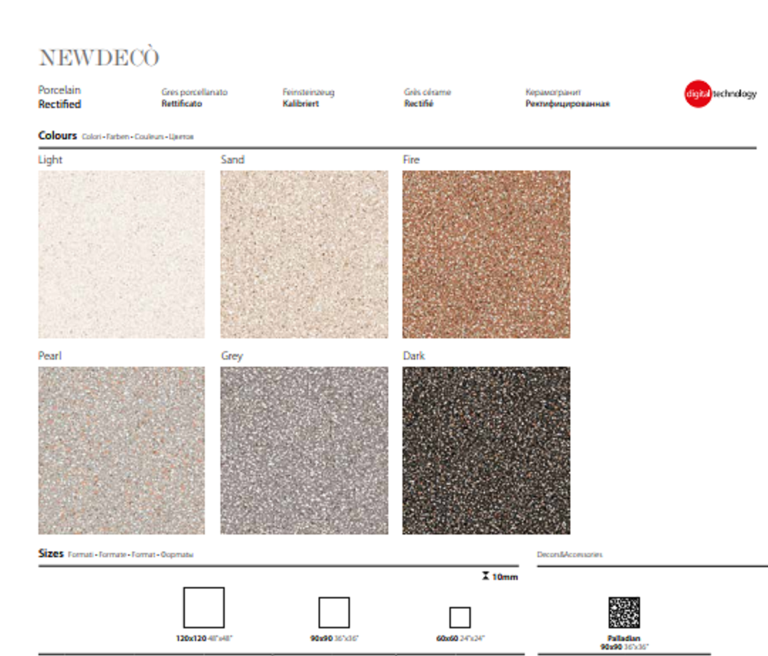 Ispirata ad un’arte diffusa dal Cinquecento al primo Novecento, NEWDECÒ. nasce per omaggiare i seminati in graniglia di marmo,innovando una tecnica usata sin dall’antichità dai maestri artigiani che percepirono la bellezza della combinazione degli elementi semplici e naturali. In equilibrio tra le geometrie e le cromie, NEWDECÒ diventa l’emblema della raffinatezza con un impatto di pregio tipico dei palazzi della nobiltà veneziana o dell’alta borghesia genovese, veri capolavori di un’arte che racchiude tutta la tradizione di un design senza tempo.