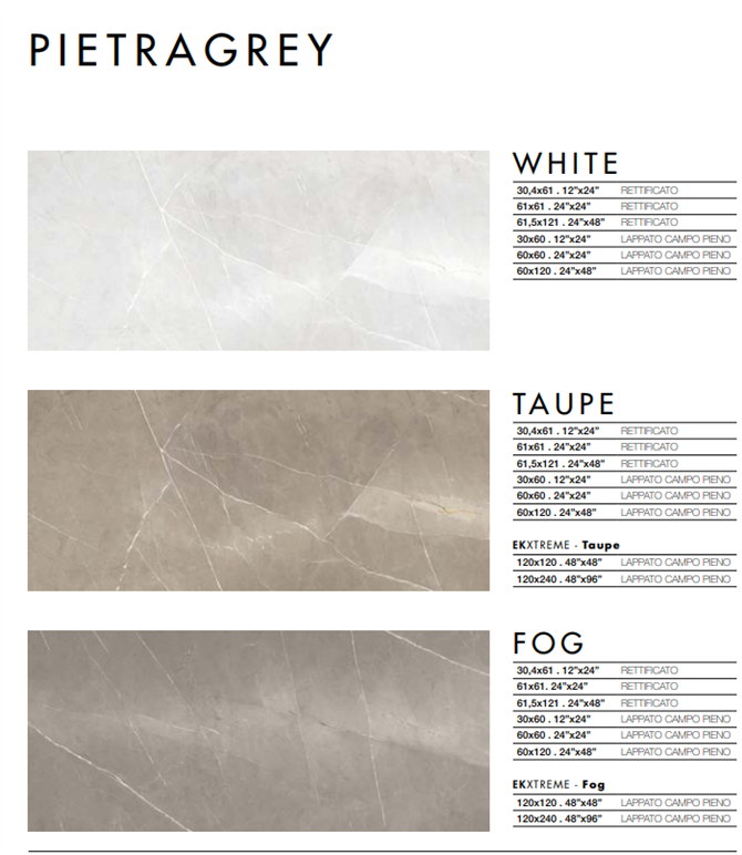 Atmosfere eleganti ed essenziali in un mix di stile e modernità: Pietragrey è il grès porcellanato effetto marmo che, attraverso superfici luminose, grandi formati Ekxtreme e venature ricercate, contribuisce ad aumentare il valore percepito di ogni ambiente. Ideale per pavimenti e rivestimenti di spazi commerciali e residenziali, si pone come ingrediente d’eccezione per un’architettura di grande impatto visivo nelle tre colorazioni White, Taupe e Fog.