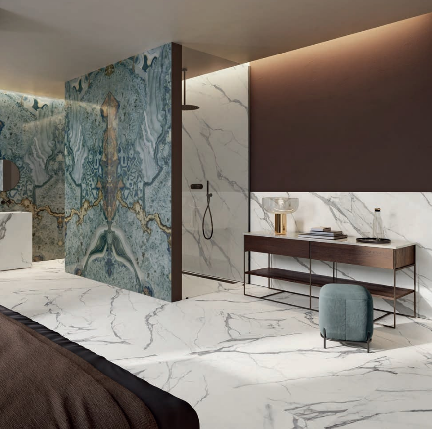 Con La Marmoteca, le pareti diventano scenografie lussuose. La re-interpretazione del marmo in grande lastra da vita a superfici da sogno, Affascinanti sfumature e preziose simmetrie per un’atmosfera carica di suggestione. Dai classici ai più fantasiosi, una gamma di superfici a effetto marmo da utilizzare in molteplici contesti abitativi. La Marmoteca  riscrive una vera e propria enciclopedia del marmo, con una collezione articolata