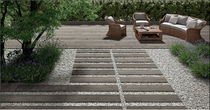 Il giardino si veste di una naturale eleganza, listoni 30x120 della gamma JUST CODE spessore 2 cm, ideali anche per comporre camminamenti e scenografici percorsi nel verde.