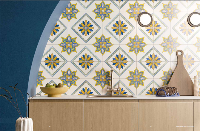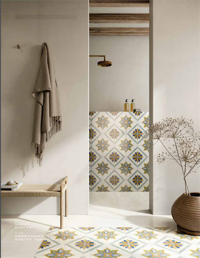 Sorrento è il decoro che più rappresenta il connubio tra il tema floreale e quello geometrico mantenendo una perfetta armonia. L’abbinamento con il fondo nei colori bianco o blu, in formato 40,6x40,6 permette di creare una continuità estetica e cromatica tra rivestimento e pavimento