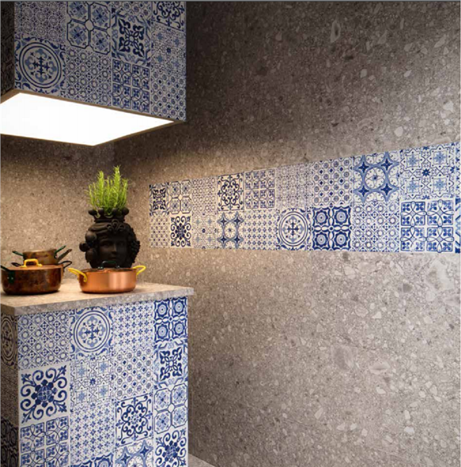 Le ispirazioni sono varie e molteplici: i colori di agrumi e piante fiorite, le forme di vicoli e case, i disegni su stoviglie e ricami tradizionali. Nella ricchezza dei soggetti decorativi si rispecchiano le culture delle terre che si affacciano sul Mare Nostrum. Finiture lucida e matt, da rivestimento e pavimento. Formati da quello base in 20x20 cm al 120x120 cm, tutti rettificati direttamente, compresi i decori, per una posa precisa anche dei soggetti singoli. Cinque fondi colorati lucidi, due fondi opachi effetto cotto e pietra.