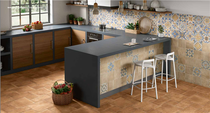 ricordano il cotto fatto a mano. Fondi, esagone, mosaici e decori maiolicati si coordinano per creare infinite soluzioni ricche di fascino e di calore.