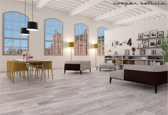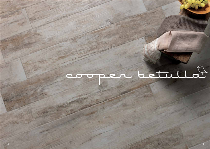 PAVIMENTO COOPER BETULLA 20X120 un pavimento gres porcellanato in massa rettificato effetto legno Il fascino delle origini, delle vecchie case costruite con materiale grezzo che profuma ancora di bosco. Il carattere deciso di un movimento grafico intrigante che diventa protagonista dell’ambiente. Cooper sorprende per la ricchezza progettuale che nasce da queste ispirazioni. L’aspetto vissuto permette realizzazioni di tendenza mantenendo un spirito caldo, vivo ed accogliente strizzando l’occhio ad un passato non così lontano.