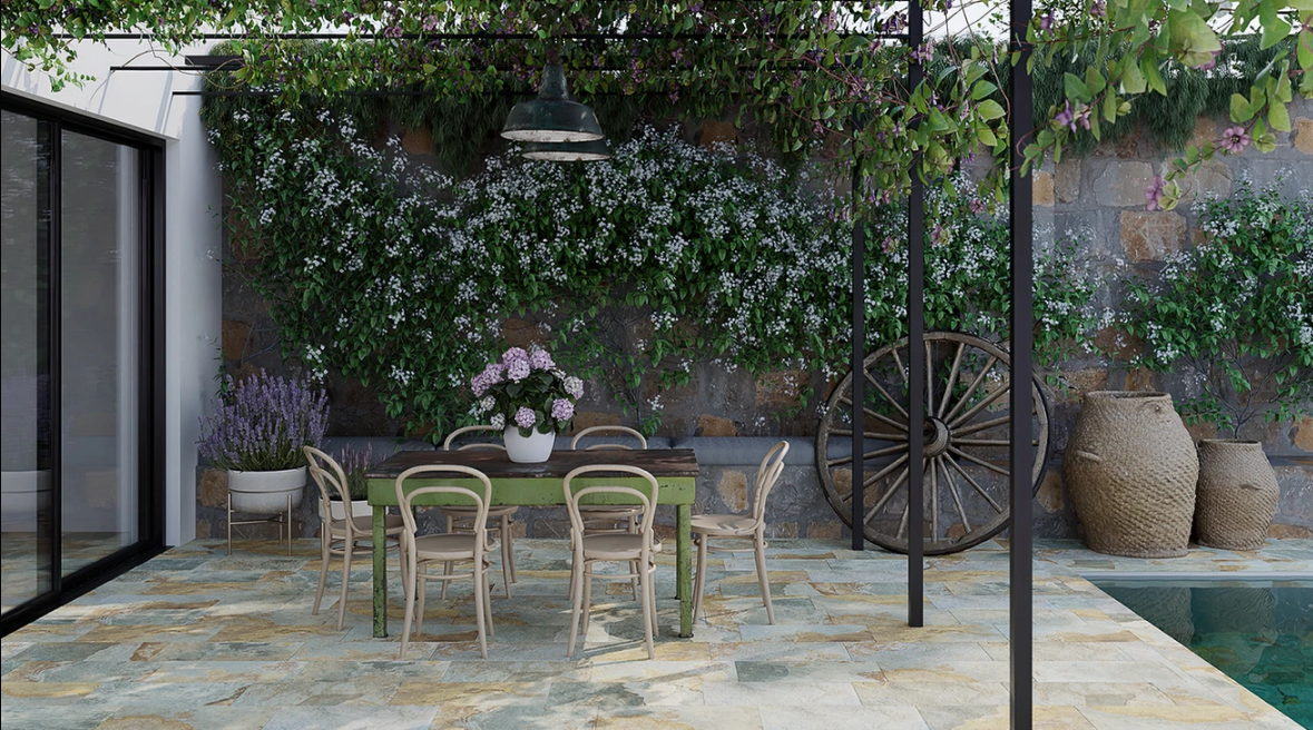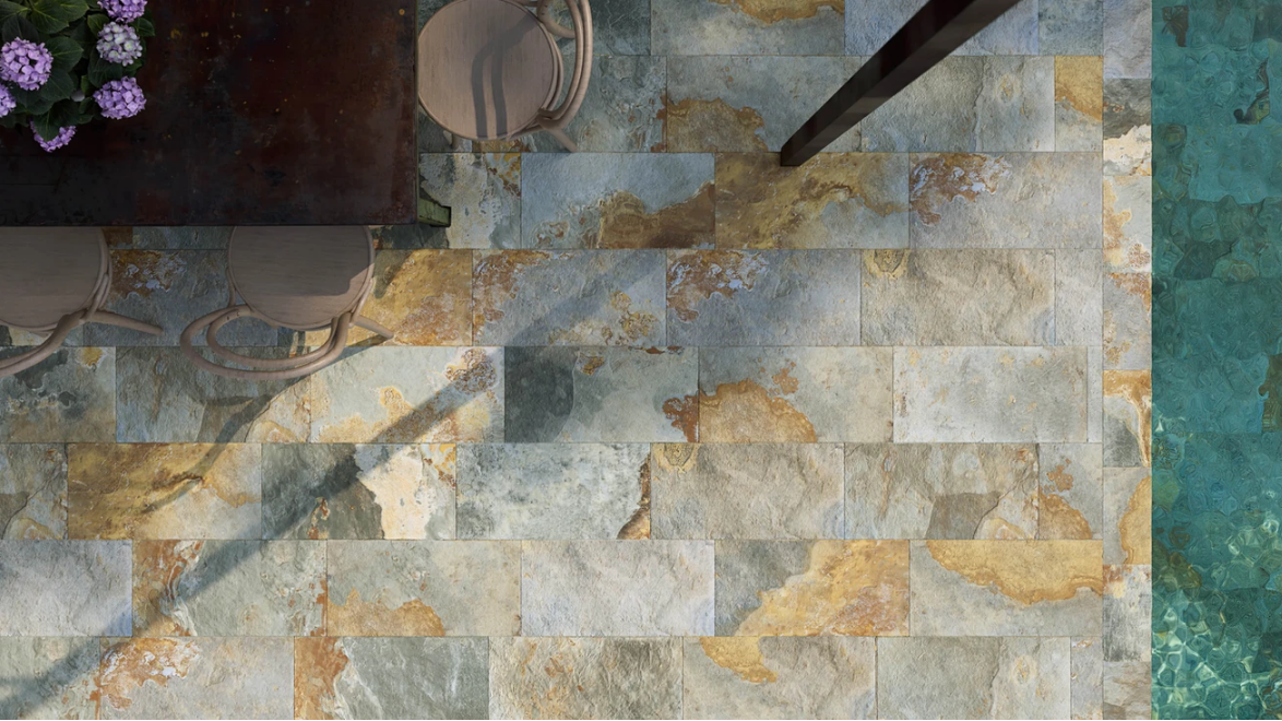 Thai, con le sue caratteristiche variazioni cromatiche, evoca l’incanto del processo naturale delle antiche Pietre di Bali che, grazie alla corrosione dell’acqua, creano un gioco di colori meraviglioso con incredibili sfumature di verde smeraldo, grigio ardesia, marrone ruggine e blu. le differenti venature, sfumature e strutture presenti nella pietra originale e ci trasmette una sensazione di connessione con la natura. Thai riprende dunque la bellezza di questa magica pietra naturale difficilmente reperibile,