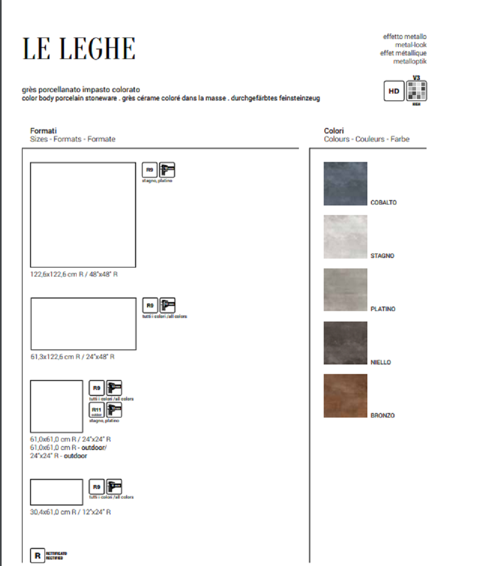 PAVIMENTO LE LEGHE NIELLO, RIVESTIMENTO STAGNO, GRESS PORCELLANATO IMPASTO COLORATO Questo progetto è ispirato al magico gioco cromatico dei metalli e dalle loro infinite sfumature sottilineate e generate da sorprendenti effetti luminosi. Cinque finiture cromatiche,accuratamente selezionate per potenziare la bellezza del materiale ceramico.