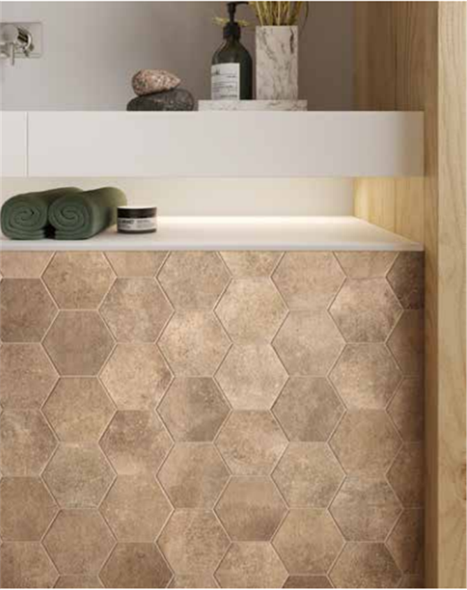 ricordano il cotto fatto a mano. Fondi, esagone, mosaici e decori maiolicati si coordinano per creare infinite soluzioni ricche di fascino e di calore.