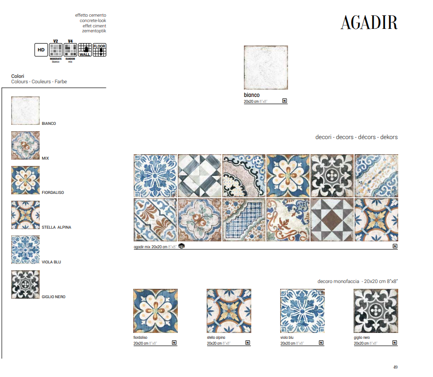 RIVESTIMENTO BAGNO AGADIR 20X20 GRESS PORCELLANATO SMALTATOFigure geometriche stilizzate si alternano armoniosamente per comporre tavolozze cromatiche calde e familiari. Il fondo, che si ispira alla pergamena anticata, ne sottolinea l'esotismo rendendolo gradevole e gioiosamente abitabile