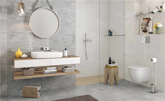 Se cercate qualcosa di davvero speciale per dare carattere al vostro bagno, i rivestimenti in bicottura atomizzata Harmony fa al caso vostro. Abbinando le piastrelle lisce e neutre al decoro onda 3d Wave e al Decoro Mix effetto cementine, si possono ottenere risultati inaspettati, grazie anche alla finitura lucida.
