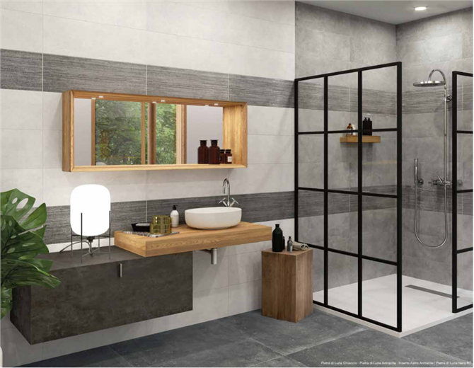 Pietra di Luna è una serie che si ispira alla Pierre Bleue Belge, una pietra dal colore che va dal grigio blu al grigio nero caratterizzata dalla presenza di numerosi residui fossili marini. Questa grafica si sviluppa sulla superficie ricordandoci la forza inarrestabile del tempo che scorre e che muta la materia dandole ancora più forza e consistenza. Abbiamo sviluppato la serie per offrire un’emozione di materialità naturale che possa esprimersi in tutti gli ambienti, dall’interno all’esterno, grazie ai vari formati, spessori, pezzi speciali e decorazioni.