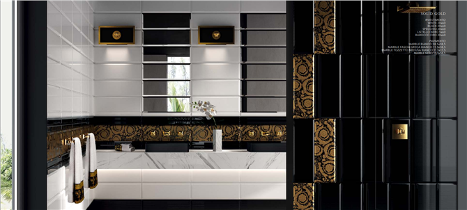 Le superfici Versace Ceramics sono pensate per trasferire il lusso e l'eleganza esclusiva del lifestyle Versace in tutti gli ambienti della casa, a partire dai pavimenti passando per le collezini living, fino alla sala da bagno . In ogni contesto progettuale i soggetti iconici della maison diventano preziosi elementi decorativi , che insieme alle lastre ceramiche , trasformano gli spazi in ambienti sempre unici e speciali . la cui bellezza viene esaltata dalle grandi lastre e dall'effetto scintillante delle superfici , Nella collezione trovano spazio marmi di provenienza Italiana , tradizionalmente presenti nelle dimore nobiliari , così come altre varietà dal fascino esotico, caratterizzate da accenti di colore che richiamano l'opulenza delle pietre preziose .