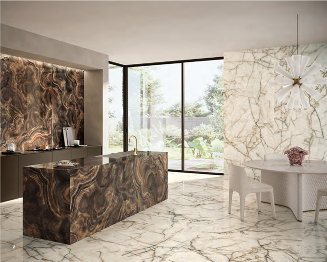 La collezione GEMSTONE è ispirata alle pietre semipreziose più eleganti che la natura ha saputo creare nel corso dei millenni. Superfici in grande formato che abbracciano una nuova idea di lusso, che privilegia le forme organiche e i materiali più rari e sofisticati. Il design incontra l’idea di una bellezza naturale, nella quale le sorprendenti sfumature degli onici e le profondità dei cristalli colorati disegnano pavimenti inediti e quinte scenografiche per gli spazi della casa e dell’ospitalità. . Grandi lastre 120x280 in spessore 6 mm, pavimenti e rivestimenti nei formati 120x120 e 60x120 possono essere abbinati a preziosi elementi decorativi iconici della maison per trasformare gli spazi in ambienti sempre unici e speciali.