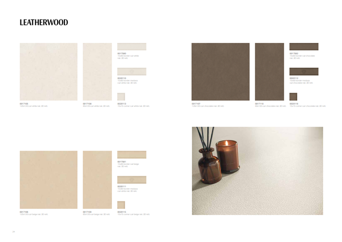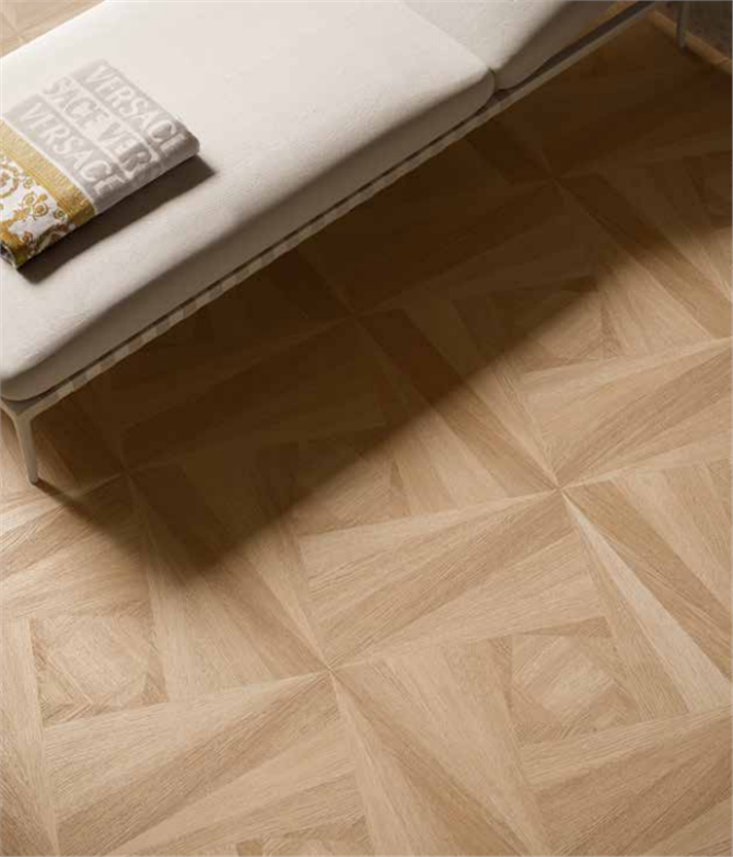 Con il progetto Leatherwood, Versace Ceramics propone nuove superfici pensate per gli ambienti di lusso, dall’eleganza esclusiva e contemporanea Il legame tra moda e design s esprime catturando l'essenza di materiali pregiati, come la pelle martellata e i parquet in legno naturale. La collezione valorizza le qualità di entrambi i materiali e li re-interpreta attraverso inedite commistioni decorative dal mood geometrico e tridimensionale ,sono pensate per trasferire il lusso e l’eleganza esclusiva del lifestyle Versace in tutti gli ambienti della casa, a partire dai pavimenti, passando per le zone living, fino alla sala da bagno. In ogni contesto progettuale i soggetti iconici della maison diventano preziosi elementi decorativi, che insieme alle lastre ceramiche, trasformano gli spazi in ambienti sempre unici e speciali.