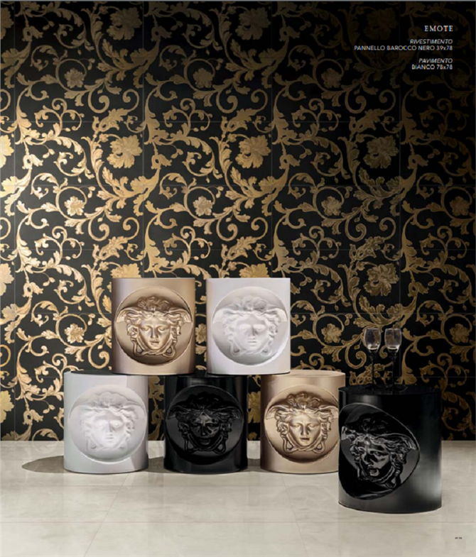 Le superfici Versace Ceramics sono pensate per trasferire il lusso e l'eleganza esclusiva del lifestyle Versace in tutti gli ambienti della casa, a partire dai pavimenti passando per le collezini living, fino alla sala da bagno . In ogni contesto progettuale i soggetti iconici della maison diventano preziosi elementi decorativi , che insieme alle lastre ceramiche , trasformano gli spazi in ambienti sempre unici e speciali . la cui bellezza viene esaltata dalle grandi lastre e dall'effetto scintillante delle superfici , Nella collezione trovano spazio marmi di provenienza Italiana , tradizionalmente presenti nelle dimore nobiliari , così come altre varietà dal fascino esotico, caratterizzate da accenti di colore che richiamano l'opulenza delle pietre preziose . ARTICOLI PRODOTTI DALLA VERSACE CERAMICS