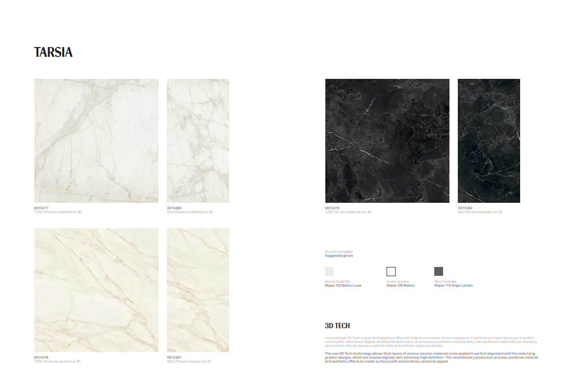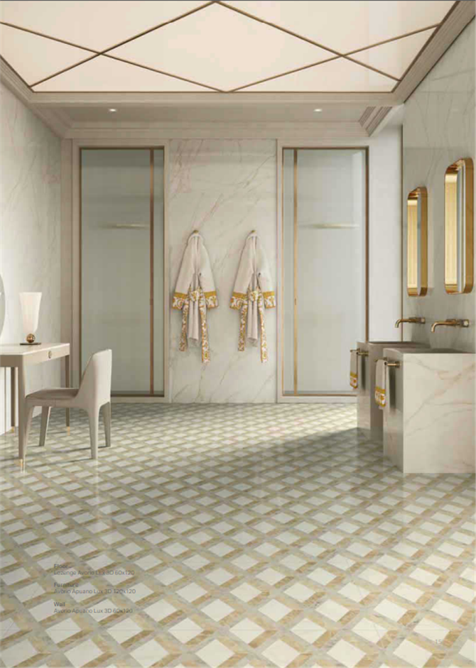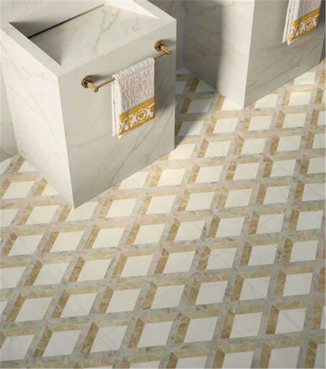 Le superfici Versace Ceramics sono pensate per trasferire il lusso e l’eleganza esclusiva del lifestyle Versace in tutti gli ambienti della casa, a partire dai pavimenti, passando per le zone living, fino alla sala da bagno. In ogni contesto progettuale i soggetti iconici della maison diventano preziosi elementi decorativi, che insieme alle lastre ceramiche, trasformano gli spazi in ambienti sempre unici e speciali Le superfici Tarsia ricreano il fascino dei marmi d’epoca intarsiati con pattern ispirati agli iconici pavimenti di Palazzo Versace in via Gesù. Casa milanese della Maison e sede storica dell’Atelier Versace, è il luogo in cui ha avuto inizio il mito dell’estetica Versace, che nella moda così come nell’interior design, coniuga perfettamente l’eleganza della classicità con il lusso contemporaneo. Le finiture anticate dall’aspetto “tridimensionale”, oltre ai sofisticati accostamenti tra preziose varietà marmoree, consentono di trasformare ogni spazio in un ambiente esclusivo e ricercato, anche in abbinamento alle altre collezioni Versace Ceramics.