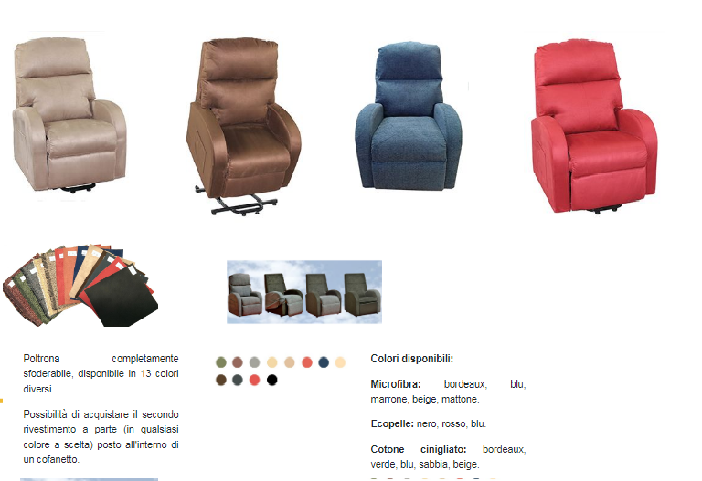 POLTRONA DISABILI O TERZA ETA'  LUCREZIA  OPTIONAL SECONDO RIVESTIMENTO A SCELTA TRA I COLORI DISPONIBILI €. 120,00 ” Poltrona lift (alzapersona), a un motore,  completamente sfoderabile movimento anticipato della pediera, dotata di 2 rotelle posteriori, pistone tedesco Okin. Lift: posizionamento in altezza della seduta della poltrona, grazie al pistone Okin supporta un'alzata massima di Kg. 170. Relax: posizionamento schienale e poggia gambe, nella versione ad 1 motore il pistone della poltrona permette di regolare in modo sequenziale l'inclinazione dello schienale e del poggia gambe mentre nella versione a 2 motori i 2 pistoni separati della poltrona permettono di regolare in modo del tutto indipendente l'inclinazione dello schienale e del poggia gambe (reclinazione a 180° "posizione letto") - Fornita ad 1 motore e a 2 motori - Kit vibro-massaggio non applicabile - Comando a cavo - Struttura in ferro - Trasformatore a 24 Volt. - Dotata di 2 rotelle posteriori. LARGHEZZA 76 cm, ALTEZZA 106 cm, PROFONDITA' 76 cm, PESO 65kg, CORRENTE 220-110 Volt (24 V), CONSUMO 80 Watt, ASSISTENZA IN TUTTA ITALIA, GARANZIA ANNI 2, CERTIFICAZIONI CE, RHOS, TUV.