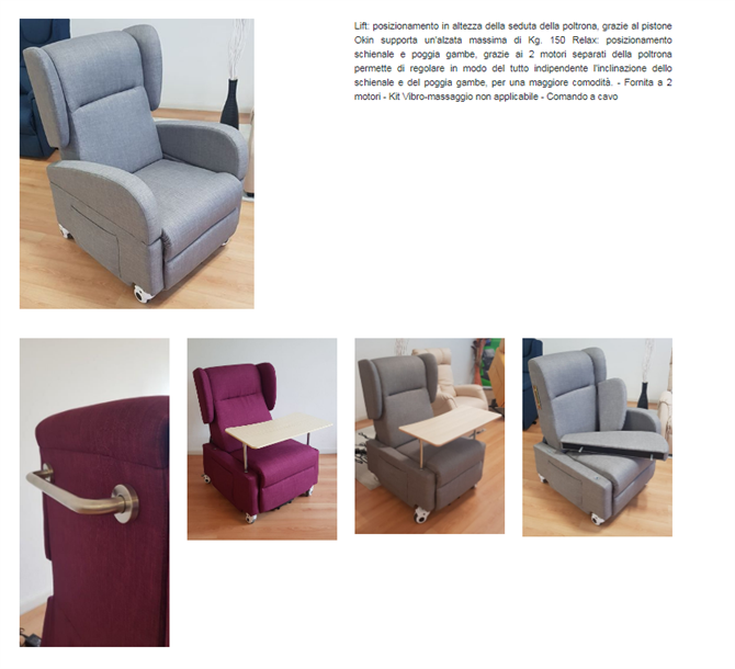 Lift: posizionamento in altezza della seduta della poltrona, grazie al pistone Okin supporta un'alzata massima di Kg. 150 braccioli removibili, alette laterali removibili, maniglione posteriore  4 ruote di cui quelle posteriori bloccanti .Relax: posizionamento schienale e poggia gambe, grazie ai 2 motori separati della poltrona permette di regolare in modo del tutto indipendente l'inclinazione dello schienale e del poggia gambe, per una maggiore comodità. - Fornita a 2 motori - Kit Vibro-massaggio non applicabile - Comando a cavo
