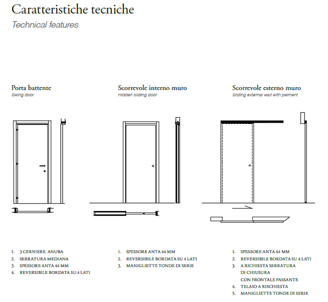ANTA .......................................• REVERSIBILE - Spessore mm 44 bordata su quattro lati • Realizzata con struttura perimetrale in abete e riempitivo in nido d’ape alveolare • Assemblata con pannelli in medium density fiber dello spessore di mm 4 cadauna facciata, rivestita in sei decorativi • Foro maniglia H 105 circa TELAIO DI SERIE........................• TS - realizzato in fibra di legno (Fibreboard) • Spessore mm. 40 rivestito in sei decorativi • Per muro da cm 8,2 a cm 10,2 • Provvisto di incastro e guarnizione in battuta • Allargamento COPRIFILO DI SERIE.................• S65 - n° 5 aste realizzato in fibra di legno (Fibreboard) • dimensione 65 x10 mm provvisti di aletta • rivestiti in sei decorativi FERRAMENTA...........................• n°3 cerniere anuba cromate reversibili • Serratura MEDIANA cromo satinato • Contropiastra cromo satinato