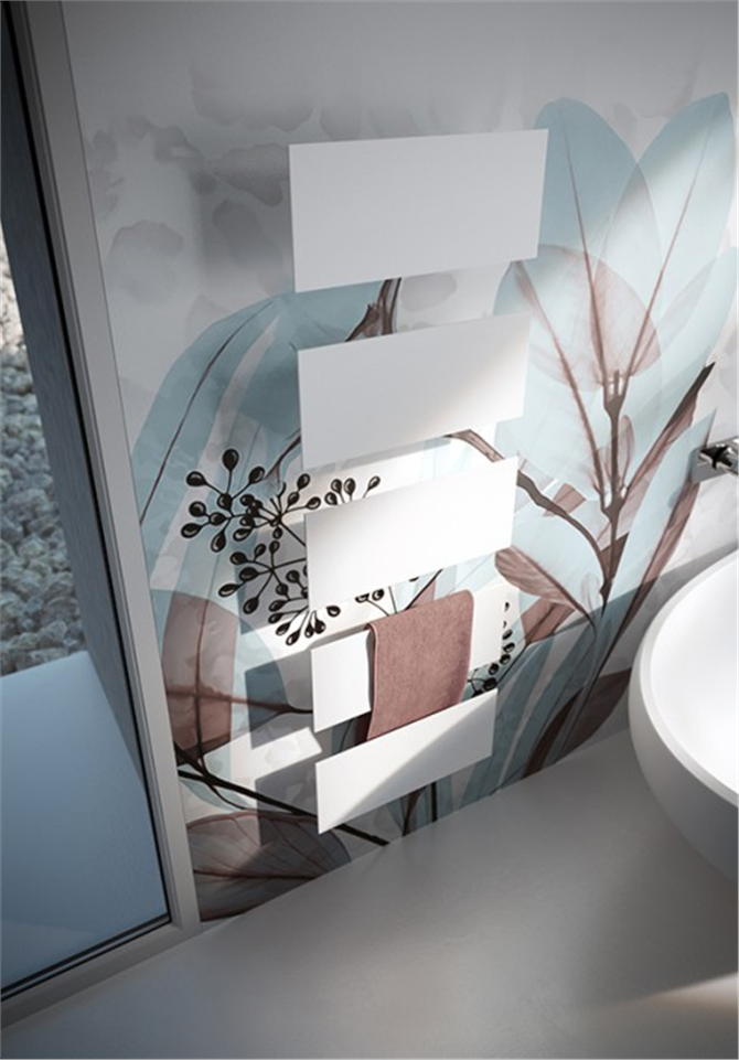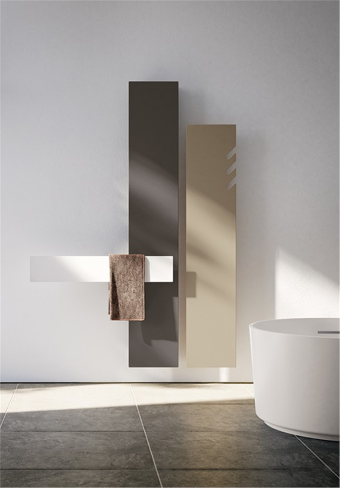 I termoarredi ultrapiatti Tavola e Tavoletta affrontano con fare diretto e pragmatico le esigenze del settore dell’arredobagno, soprattutto contract, che spesso impone di adattarsi a layout costretti e articolati, pur senza andare a scapito di un’estetica estremamente gradevole e una spiccata funzionalità. Tavola e Tavoletta sono due elementi simili, due ‘fratelli’ dalle stesse peculiarità estetiche, ma che lavorano in modo individuale e complementare. Tavola può essere ordinato in diverse configurazioni, secondo il carattere dell’ambiente in cui viene installato. Il termoarredo ultrapiatto Tavola può essere posizionato in verticale e in orizzontale e, grazie a un intaglio nella piastra o all’applicazione di uno speciale supporto, diventa porta accappatoio. Tavola può essere inoltre dotato di uno specchio dello stesso spessore della piastra stessa, che non viola la continuità della struttura e mantiene la pulizia e la linearità del progetto, enfatizzando il concetto di ‘arredo’ nel suo essere ‘termo-arredo’, e unendosi agli altri elementi dell’ambiente bagno col fine di salvaguardare lo spazio senza rinunciare a comfort e bellezza. Tavoletta nasce invece come accessorio satellite, a completamento di Tavola, ma ha ugualmente una sua individualità e specifica peculiarità. Il termoarredo Tavoletta è costituito da una piastra ultrapiatta disponibile in quattro diverse dimensioni, più piccole di Tavola, e può svolgere le funzioni di porta salviette, se installato in orizzontale, e porta accappatoio o sistema di stoccaggio salviette, se installato in verticale. Il sistema di fissaggio a muro consente di variare a piacimento i punti di ancoraggio del termoarredo Tavoletta e garantisce una flessibilità di installazione che ne esalta la possibilità di combinazioni, sia usandolo a più elementi in modo modulare, sia abbinandolo al termoarredo Tavola. Tavoletta è disponibile solo nella versione con piastra elettrica a basso consumo, e in questo caso può svolgere la funzione di scalda salviette o accappatoio, trasformandosi da accessorio a vero e proprio termo arredo. Se usato in modo modulare e in sequenza, Tavoletta, oltre a svolgere la sua normale funzione può contribuire in toto a soddisfare le esigenze in termini di riscaldamento di un piccolo ambiente bagno. Tavola: 171 x 35 cm e 201 x 35 cm Tavoletta: 40/60/80/100 x 18 cm