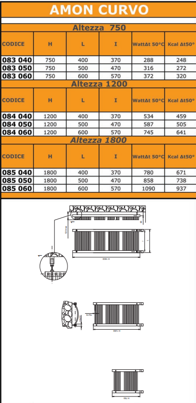 Amon curvo è proposto nelle versioni a riscaldamento tradizionale, elettrico e misto idro/elettrico.
