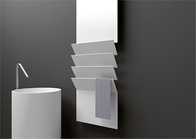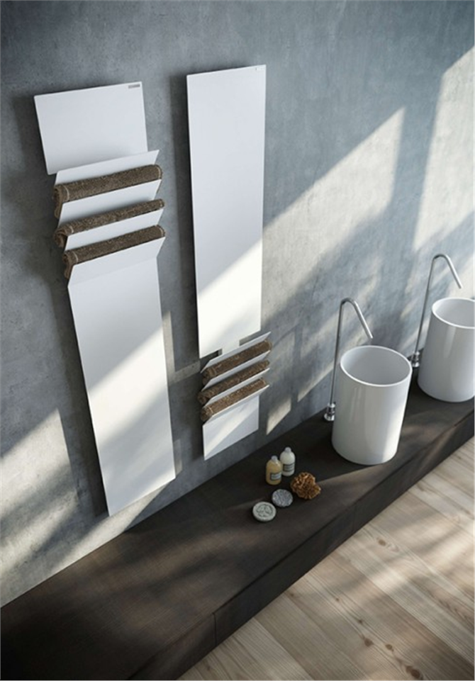 Flaps è il nuovo radiatore ad alta efficienza  L’idea di questo progetto nasce dall’osservazione delle forme e del funzionamento del radiatore a piastra. La ‘pulizia’ formale del radiatore scompare nel momento in cui viene aggiunto l’accessorio necessario per agganciare una salvietta o l’accappatoio.