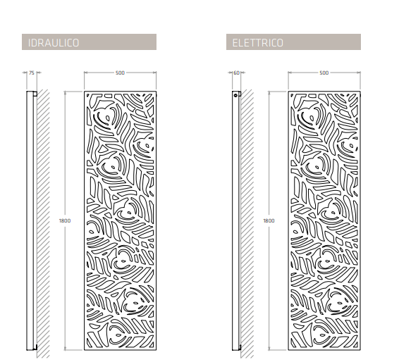 Figure simili a piante e fiori, richiamo evidente allo “stile floreale” che contaminò l’arte a cavallo del Novecento e che in Italia venne definito Stile Liberty: Nouveau gioca con una superficie “intagliata”, che si sovrappone ad un volume puro, a creare un effetto decalcomania in rilievo, valorizzato dal contrasto cromatico fra il disegno e lo sfondo, proposto in colori differenti anche molto accesi. Disponibile anche il termoarredo elettrico che è programmabile con app dedicata, interruttore integrato RGB con visualizzazione cromatica della temperatura, doppio sistema di alimentazione.Disponibile in tutte le colorazioni Ral , Ecomalta , Anodiche e Micacee .