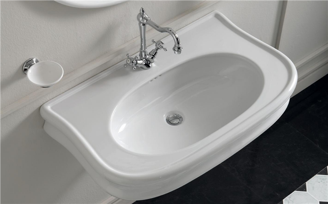 La Nuova Era si lega al classico: forme morbide, pure e rassicuranti. La limpidezza della ceramica bianca abbinata ai mobili studiati su misura riflette