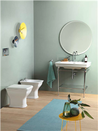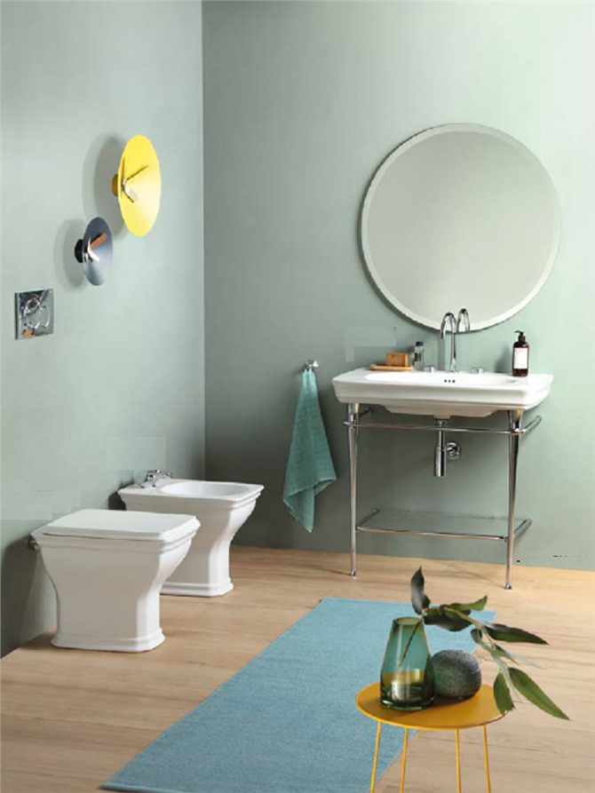 SANITARI VASO CIVITAS FILO MURO Civitas ridisegna il modello della colonna classica, icona architettonica portante,dandone una versione dal design raffinato e contemporaneo, applicato alla ceramica sanitaria. Curve e superfici ben proporzionate definiscono lo spazio in verticale. La base di forma ottagonale è caratterizzata da fasce sagomate lisce con funzione decorativa a sostegno della colonna in ceramica, vero elemento caratterizzante la collezione, su cui è appoggiato il morbido catino ovale. Un progetto ispirato ai valori della memoria e della tradizione, per una collezione senza tempo