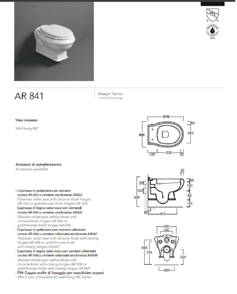 SANITARI DA BAGNO VASO SOSPESO BIANCO MODELLO ARCADE OLD ENGLAND